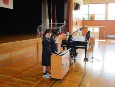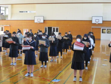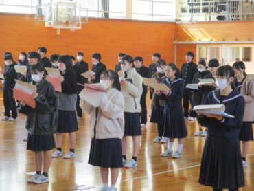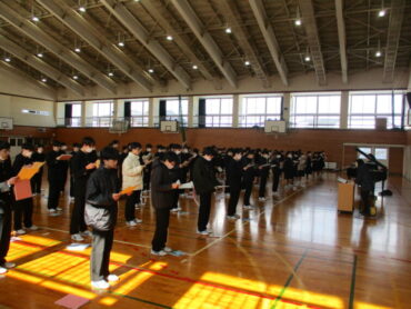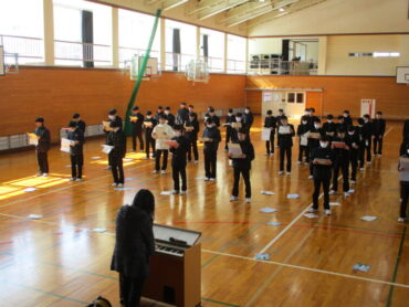 2026.2.13 NEW 3学年 3年 学年合唱練習 3年生は、卒業式に向けて学年合唱の練習を体育館で行いました。卒業式まであと1か月となり、少し寂しい気持ちですが、卒業式に素晴らしい歌声をみんなに聞かせてください。 音楽科の先生の指導で、次第に大きな歌声になり、体育館に素敵な歌声が響いていました。 気持ちよく巣立ちの瞬間を迎えられるよう、しっかりと練習をしていきましょう。