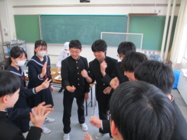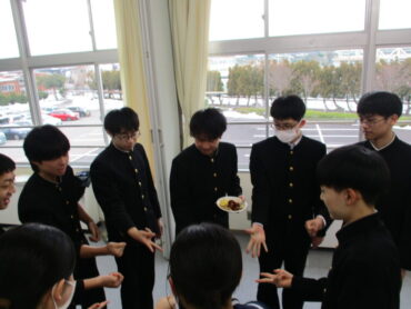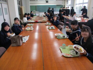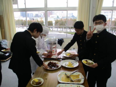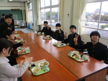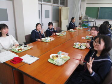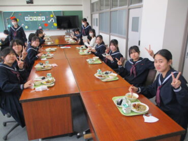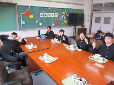2026.2.16 3学年 給食 3年 卒業ランチ① 卒業式まで残り1か月を切り、3年1組の卒業ランチがありました。石瀬共同調理場の皆さんが、卒業生のために特別なメニューを準備されて行いました。生徒は、この日を何日も前から楽しみにしていました。いつもの給食にクレープや肉団子、星形たまごも追加される豪勢な内容です。生徒は、美味しい給食を食べて笑顔でいっぱいでした。ありがとうございました。
