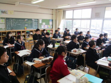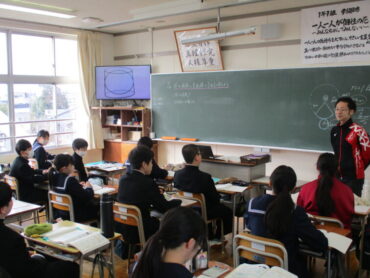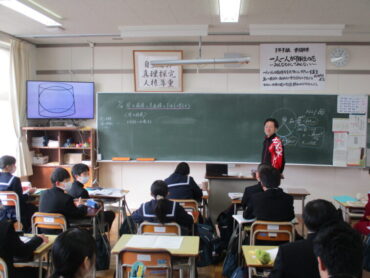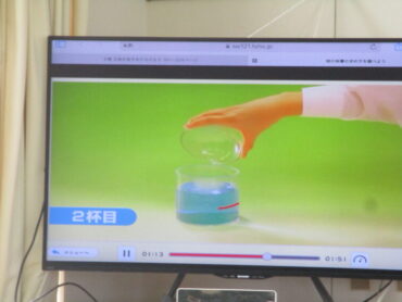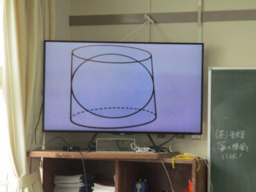 1年生は数学の時間に球の体積の求め方について考えていました。球と円柱の関係については、球の体積は、球がぴったり収まる円柱の体積の2/3に相当するのですが、なかなか見た目では判断できません。みんなで予想を立てながら話し合っていました。水を入れて確認する動画で確認してみたらピッタリになることに歓声が起こっていました。デジタル教科書はすごいです!