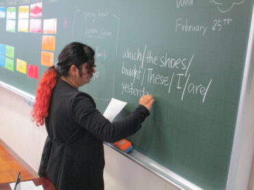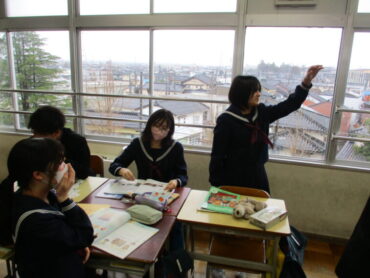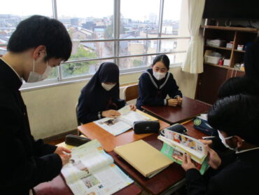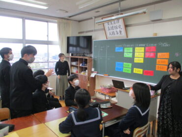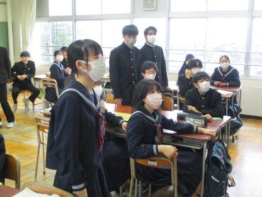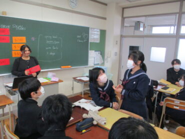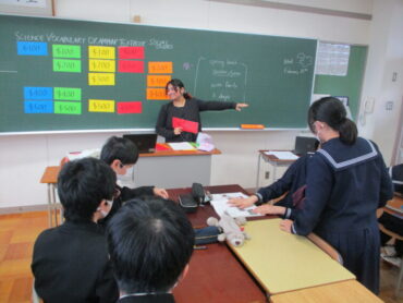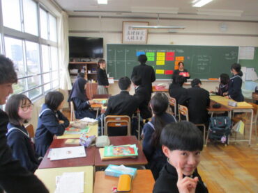 3年生は、英語でALTの先生と恒例の「クイズ大会」を行いました。語彙や並べ替え等のジャンルの中から100点~500点のクイズカードを選択し、その得点に応じた難易度の質問をALTの先生が行います。正解すると、各班にポイントが入るゲームです。どの班も協力的で白熱したクイズ大会になりました。これが中学校生活最後のクイズ大会かもしれませんね!