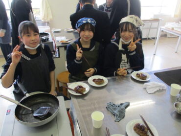 2年生は家庭科で調理実習(ハンバーグ)を行いました。まず玉ねぎをじっくり炒めて甘みを引き出し、その後に形を整えたハンバーグを焼きながら、竹串を使って中まで火が通っているか丁寧に確認しました。こげないようにフライパンの様子をこまめに見守りながら仕上げました。最後は、出来上がったハンバーグをみんなでおいしくいただきました。家でもぜひ挑戦してください!