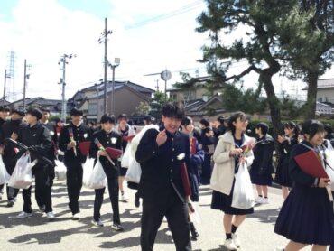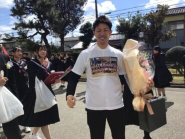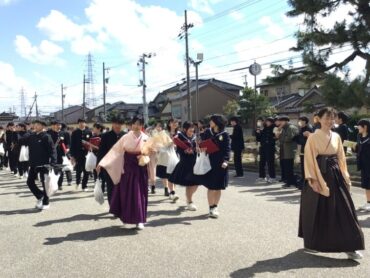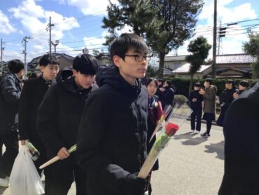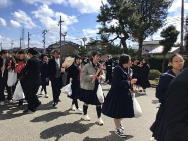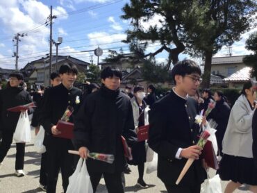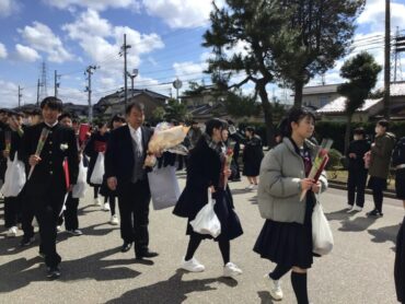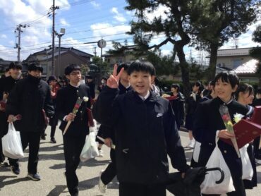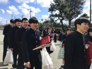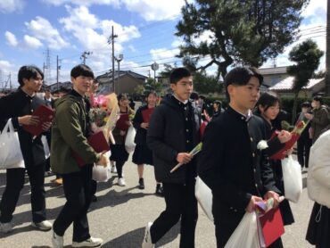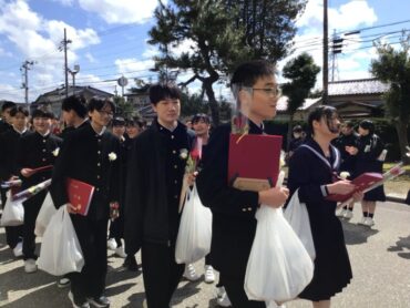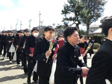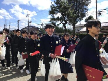 2026.3.12 3学年 全校生 門送り② 卒業証書授与式後は、自分のクラスで最後の学活を行い、お世話になった担任の先生に感謝の気持ちを伝えていました。先生も最後の温かいメッセージを伝えておられました。門送りでは、保護者の皆さんや在校生が生徒玄関前に勢ぞろいで、吹奏楽部の演奏のもと盛大に卒業生を送りました。青空の中、温かい雰囲気の中、卒業生は羽ばたいていきました。立派になった卒業生に感動です!