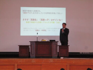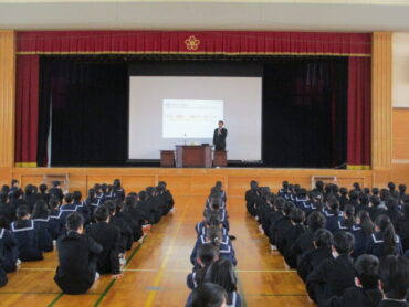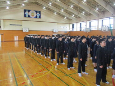 2026.3.24 NEW 全校生 3学期終業式・修了式・授賞集会 3学期の終業式、令和7年度の修了式が行われました。授賞集会後、柿埜校長からは、1年間の振り返りと、来年度の施設一体型の小中一貫校について、「こんな学校にしていってほしい」ことをスライドを交えて説明されました。今まで積み重ねてきた努力をベースに、高陵中学校がさらに高い目標に向かって進み、みんなで新しい学校を創り上げてほしいことを力説されました。 高陵生全員の力を合わせて頑張りましょう!