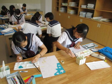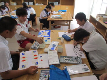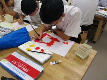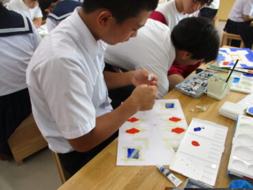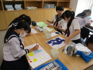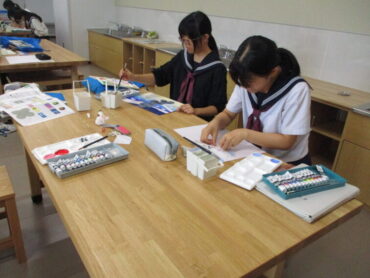 3年生は、1学期末に取り組んでいた一点透視図法の作品の仕上げに入っていました。下書きのラインに沿って丁寧に色を入れていました。マスキングテープを活用して色をはみ出さないように工夫している生徒も多かったです。新しい美術室で気持ちよく丁寧に仕上げましょう!
