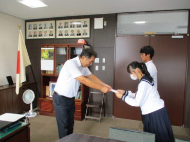 JVA全国ヤングクラブバレーボール大会及び北信越ジュニア新体操女子選手権大会、JOCジュニアオリンピックカップU16陸上競技大会の壮行会が校長室で行われました。本校の生徒3名がクラブチームより出場します。生徒は、大会に向けての意気込みを語ってくれました。柿埜校長からは、和歌山県や新潟県、三重県で行われる大会で、高陵生らしく自分の力を存分に発揮してほしいと激励の言葉がありました。高陵生ファイト!