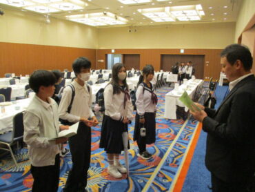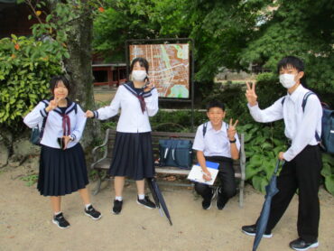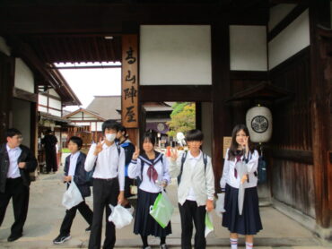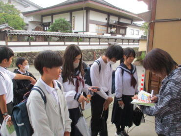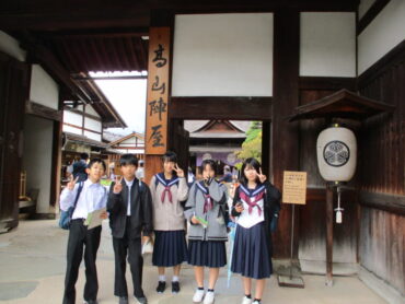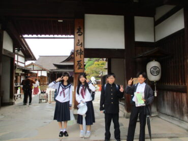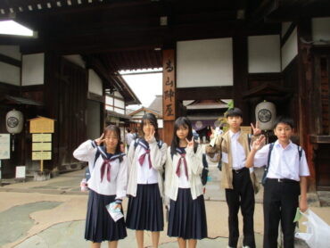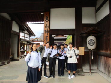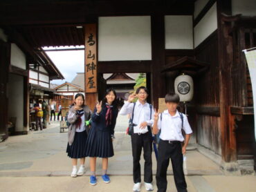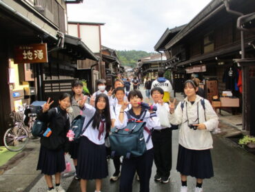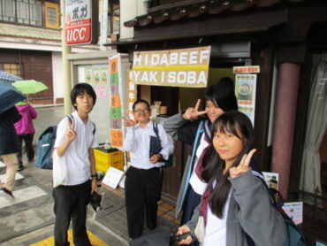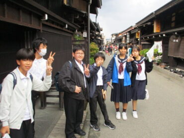 1年生は、高山終日校外学習に行ってきました。午後は、ひだホテルプラザで昼食を食べた後、高山陣屋をチェックポイントにした高山市内班別学習を行いました。途中、雨にあいましたが、各班自分たちの目標を決めて観光名所や古い町並みを見学しました。みたらし団子や飛騨牛コロッケ、メンチカツを食べた班もあったようです。おみやげも購入することができ、生徒はみんな笑顔でした。友達との絆を強めるよい機会となったと思います。