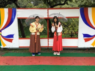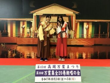 10月5日(日)に高岡万葉まつりが古城公園でありました。本校の1年生2名が、万葉集全20巻朗唱の会に参加しました。生徒は、本格的な万葉衣装を着用して第17巻 3901番~3906番を朗唱しました。中の島の特設水上舞台で、気持ちよく朗唱し万葉の文化に触れることができました。がんばりましたね!