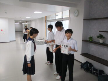 高陵中学校では、JRC委員会が中心となり、今日から「赤い羽根共同募金」を生徒玄関で始めました。共同募金は、被災した福祉施設を中心に支援が行われ、地域福祉の推進のために活用されています。毎年、この時期に高陵中学校は、この募金に協力しています。ぜひ、みなさん協力してください。