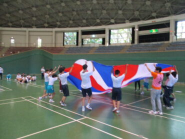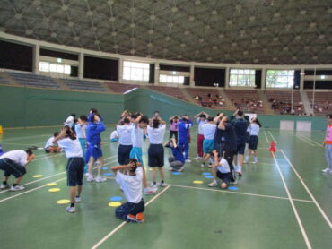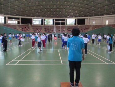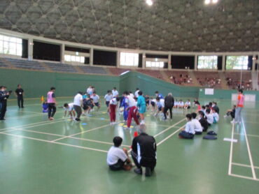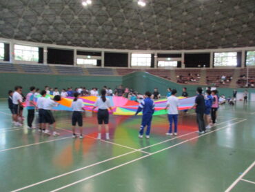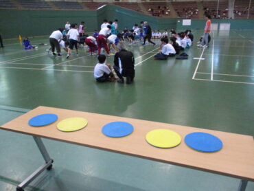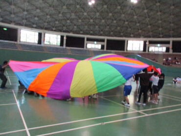 東洋通信スポーツセンターで、高岡市内すべての中学校の支援級の生徒が集まり、交流学習を行いました。開会式を行った後、班に分かれて自己紹介をし合いました。富山大学の澤聡美先生の指導の下、大学生のお兄さんお姉さんと一緒に「みんなでチャレンジ!運動遊び教室」を行いました。生徒は元気よく「体力系オセロゲーム」や「パラシュート」を他校の生徒と一緒に楽しみました。