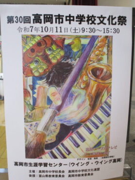 10月18日(土)、ウイング・ウイング高岡で第30回高岡市中学校文化祭が開催されています。作品展示部門では、高陵中学校からは、美術作品や美術部の平面作品や立体作品、新聞部、書道の作品が展示されています。他にも理科学習発表会やステージ発表で高陵中学校の生徒が活躍しています。ぜひ、お越しください。待っています。