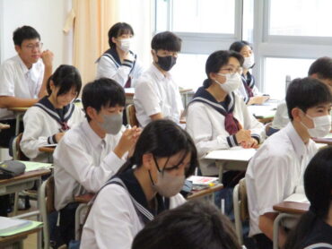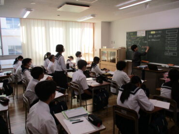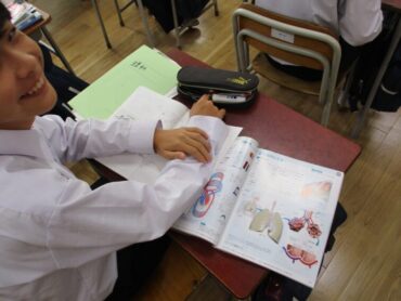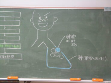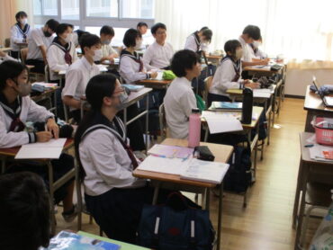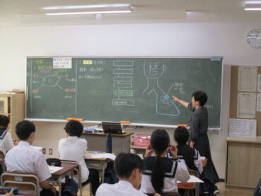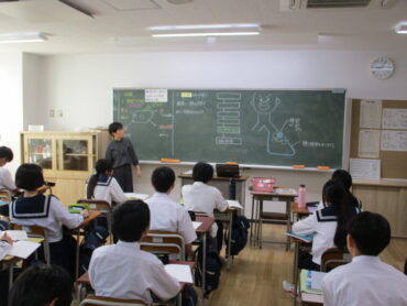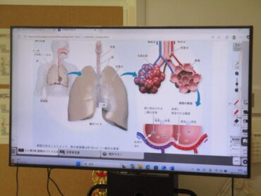 2年生は、理科で呼吸のしくみについて学習していました。私たちが何気なく呼吸している秘密を先生が丁寧に説明されていました。生徒は、肺胞にある毛細血管で酸素と二酸化炭素を交換している仕組みを分りやすい絵で解説されているとき、とても楽しそうでした。体の仕組みをしっかりと学んでください。