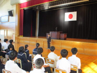 2年生の「学年人権弁論大会」を体育館で行いました。各クラスで選ばれた代表2名が、気持ちを込めて堂々と学年の生徒の前で発表しました。「自分らしさ」「声をかける勇気」「本心を伝える」「様々な人権について」等、日常の家庭生活や学校生活等の中で得た体験に基づく作文を発表しました。一人ひとり堂々と自分の意見を述べることができました。大変立派な発表でした。人権尊重の大切さや基本的人権についての理解を深め、豊かな人権感覚を身に付けてください。