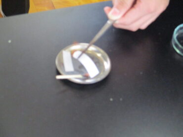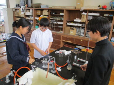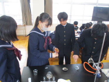 1年生は、理科の時間に「物質の状態変化」について学習しています。エタノールと水の混合物を加熱して出てきた物質が何かを実験から調べていました。蒸散で出てきた液体に火を近付ける実験をしていました。マッチをすることも学習の1つです。実験を通して生徒はたくさんのことを学びました。実験の後は、グループでしっかりとノートをまとめ、考察していました。