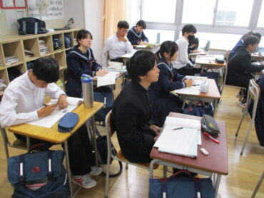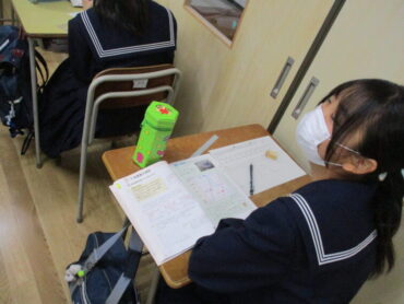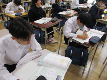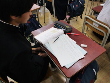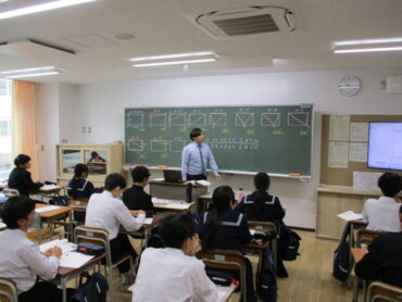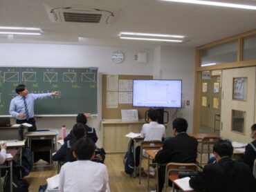 2年生は、数学の時間に「長方形 ABCD で、点PはAを出発して、辺上をB、Cを通ってDまで動きます。このとき、△APDの面積はどのように変化するか」の問いで、それぞれの面積を求めていました。生徒は様々なパターンを図示して問題に取り組んでいました。デジタル教科書も登場し、動きの変化が目でとらえることができ、大変分かりやすかったです。時代の変化を感じます。