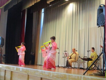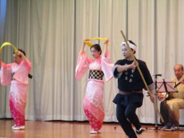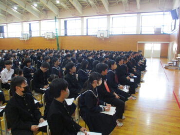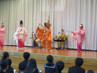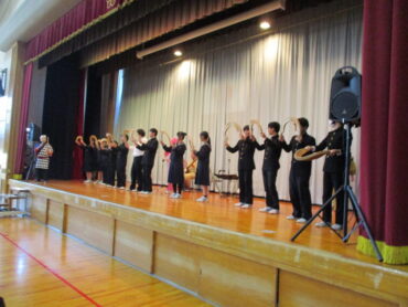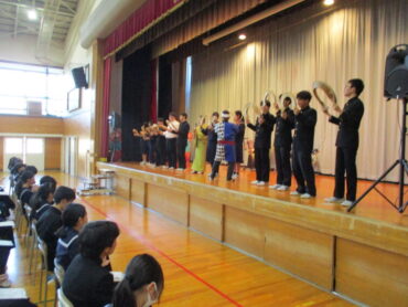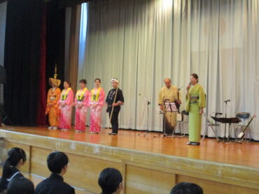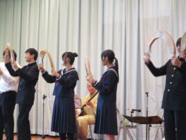 高岡市音楽科生徒対象事業で「民謡鑑賞会」が実施されました。全校生徒で芸能鑑賞を楽しみました。こきりこ節、弥栄節、越中おわら節、帆柱起こ祝い唄等、富山県で有名な民謡を踊りと一緒に演じてもらいました。ササラの体験や全校生徒でこきりこ節を歌う場面もあり、大変盛り上がりました。日本の文化の深さや美しさを感じることができました。
