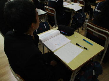 3年生は、数学で相似な図形について学んでます。三角形ABCと三角形DEFが相似である場合の表記は、△ABC∼△DEFのように表記することを学びながら、相似条件とは何かを考えていました。証明問題もあるので一番の難関の学習ですが、しっかりと着いていきましょう!集中して学習に取り組んでいました。