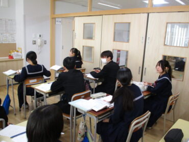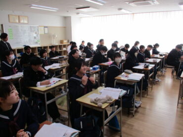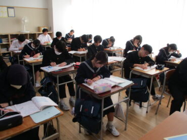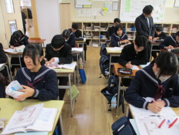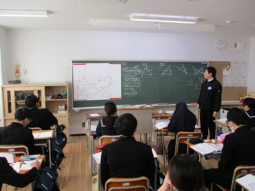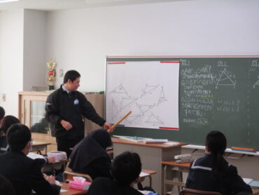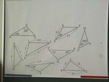 3年生は、数学で相似な図形について学んでます。三角形ABCと三角形DEFが相似である場合の表記は、△ABC∼△DEFのように表記することを学びながら、相似条件とは何かを考えていました。証明問題もあるので一番の難関の学習ですが、しっかりと着いていきましょう!集中して学習に取り組んでいました。
