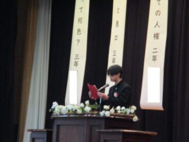 11月12日(水)、高陵人権デー(道徳授業参観)・第32回全校人権弁論大会が行われました。多くのご来賓や保護者の方にもご来校いただき、「人権」についてや「幸せに生きること」について、道徳の授業参観や代表の生徒の弁論を聴きながら考えました。