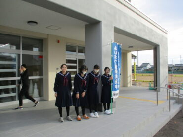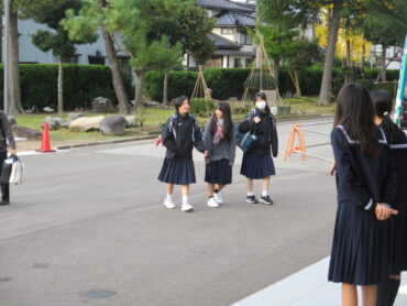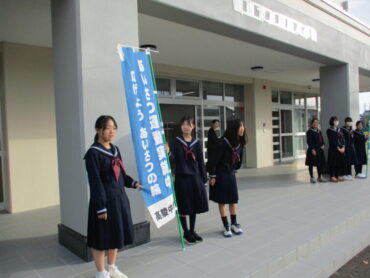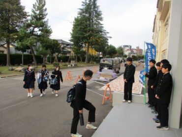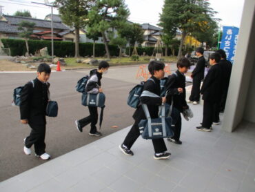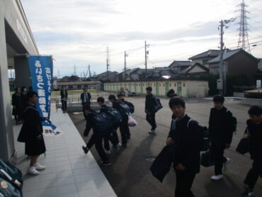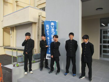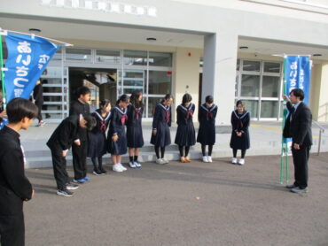 2025.11.13 全校生 あいさつ運動 さわやかな秋晴れの中、あいさつ運動を生徒玄関で行いました。人権弁論大会でも触れましたが、朝のさわやかな挨拶の声が響くと大変嬉しいです。挨拶は心の扉を開くノックとも言われます。お互いの心の扉が開くようにこれからも「語先後礼」を心掛けていきましょう。
