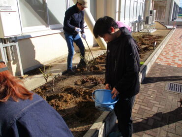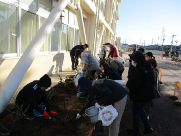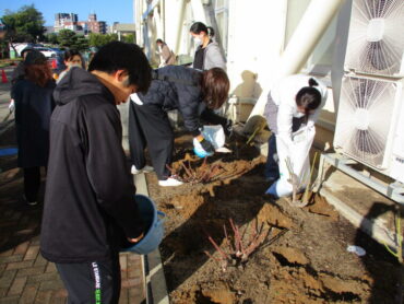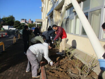 2025.11.29 高陵ばら園土壌づくり 11月29日(土)秋晴れの中、高橋さんやPTAの環境整備委員会、父親交流委員会の皆さんのご協力で、高陵ばら園の土壌づくりを行いました。ばら園のばら約120株が、来年もきれいな花を咲かせるために、ばらの根本に堆肥や骨粉などの肥料を与えました。高陵中学校が、ばらの香りで包まれているのは、保護者の方の協力があってのことです。1年間の整備、本当にありがとうございました。 来年度は、小学生もこのばらの香りを楽しむことができます。楽しみですね!