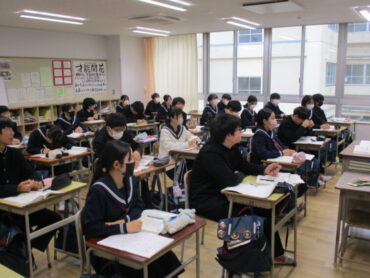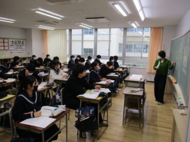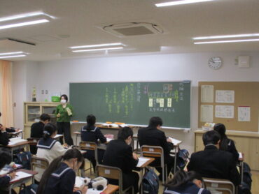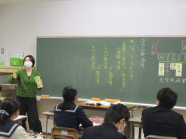2年生は国語の時間に、用言の活用について学習しています。動詞の活用には5種類あり、動詞の終わりに「ない」を付けると活用語尾が変化します。書くは、書 か ないの「か」がアの段で、五段活用です。起きるは、起 き ないの「き」がイの段で、上一段活用です。活用にはルールがあることに生徒は驚いていました。日頃、考えないで話しているので大変勉強になりました。