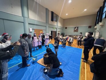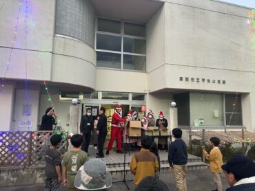 12月8日(日)夕方に平米公民館で、毎年恒例となっている「もちつき大会」と「イルミネーション点灯式」がありました。高陵中学校区の園児・児童・生徒がたくさん参加し、地域の方々が作られた豚汁を食べさせてもらいながら、「もちつき」を体験しました。フィナーレには、公民館前で「イルミネーションの点灯式」があり、サンタさんも来場して、お菓子のクリスマスプレゼントがありました。中学生もプレゼントをもらえてよかったです。