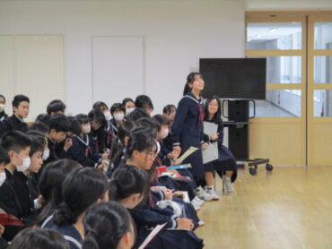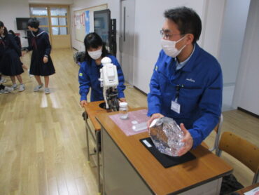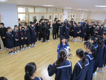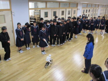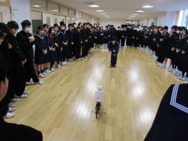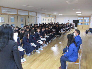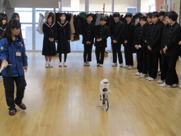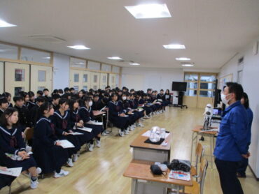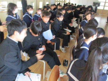 1年生で、富山県中学生ものづくり教育事業として、子供たちにものづくりの楽しさを実感し将来の夢につなげるための事業として、講師の先生を派遣していただきました。今回は、1学年の生徒全員でお話を聴くことができてよかったです。富山村田製作所の大島様、松下様にご来校していただき、会社の紹介や仕事の面白さや、やりがいについて話をしていただきました。村田製作所の製品を見せてもらったり、ロボットを動かしてもらったり、大変盛り上がりました。1年生のみなさん、自分の夢を見付ける第一歩にしてください。ご講演ありがとうございました。
