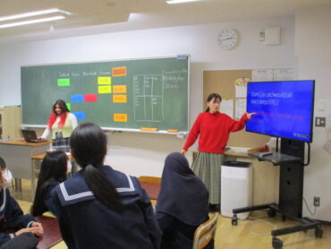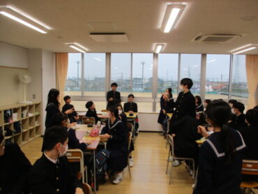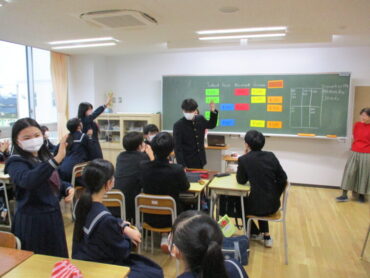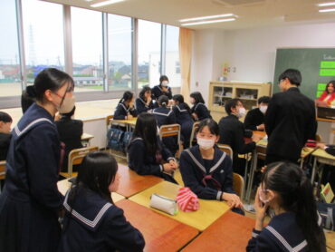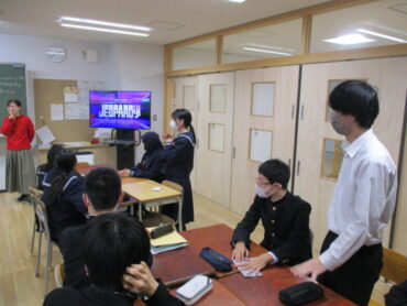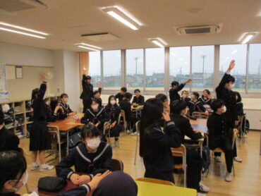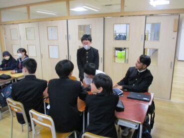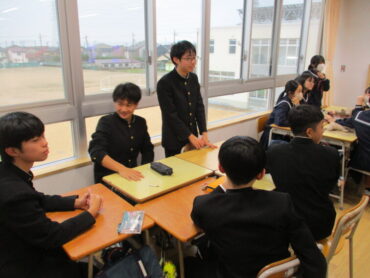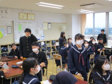 2025.12.17 NEW 3学年 3年 英語「クイズ大会」 3年生は、英語でALTの先生と「クイズ大会」を行いました。文法やクリスマス、高陵中学校等のジャンルの中から100点~500点のクイズカードを選択し、その得点に応じた難易度の質問をALTの先生が行います。正解すると、各班にポイントが入るゲームです。グループ対抗戦で、班員が協力しながら答え、盛り上がっていました。「校長先生の名前は?」という質問があり、生徒がフルネームで答えてくれて嬉しかったです。取材している立場としては、一番緊張する場面でした。
