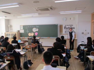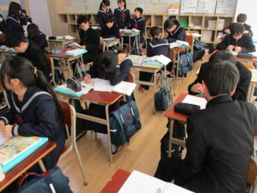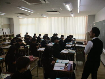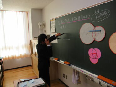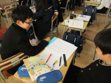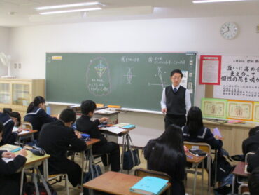 1年生は数学の時間に、線分に対しての垂線をコンパスを使って書いていました。書き方も工夫次第で幾つかのパターンがあるようです。1年生の皆さん、コンパスに早く慣れて垂直二等分線や垂線を書く問題をたくさん解いてみましょう。意外と先生の使っている黒板用の大きいコンパスは、テクニックがいるようです。