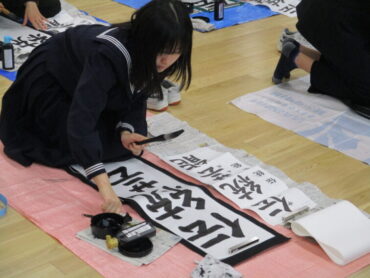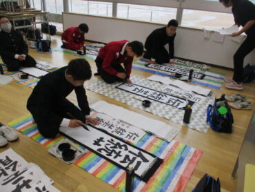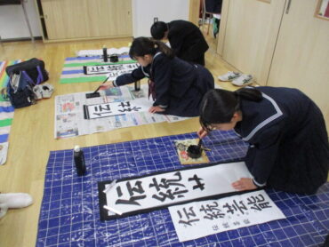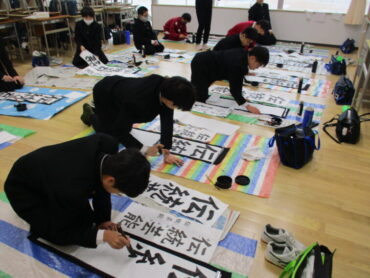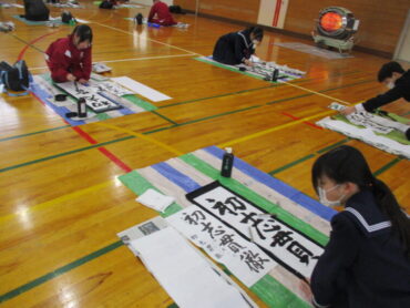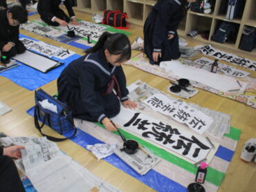「伝統芸能」「文学の地」「初志貫徹」の文字を書く生徒の表情は真剣でした。