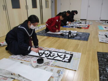 書初めは、古くから新年に初めて筆で字を書くお正月の行事。書初大会は、学校でも伝統的な行事の1つです。今年は、1・2年生が新校舎の教室やオープンスペース、3年生が体育館を使って大会を行いました。どの学年も静かに集中して、会場全体に張りつめた空気が流れていました。新年への思いを文字に込める真剣な姿が、とても印象的でした。