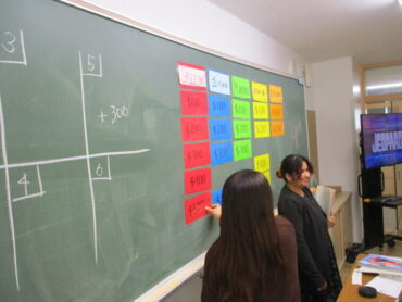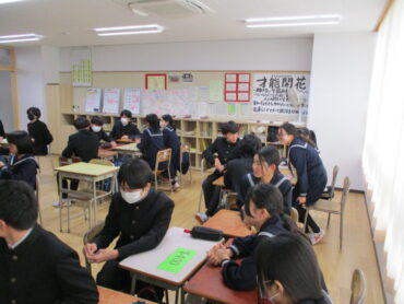 2026.1.16 2年 英語「カードクイズ」 2年生は、ALTの先生と一緒に、各ジャンルごとに「100点、200点、~500点」のように点数の異なるカードのクイズを答えるゲームを行っていました。ジャンルは、まちがい直しや穴埋め、スペル、並べ替え等、複数のクイズにチャレンジしました。グループ対抗戦なので、とても白熱しました。高得点の質問は、かなり難しい内容ですが、生徒は素早く答えていました。すごい!