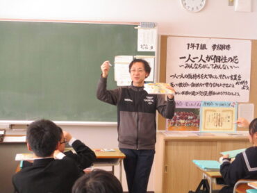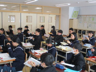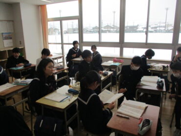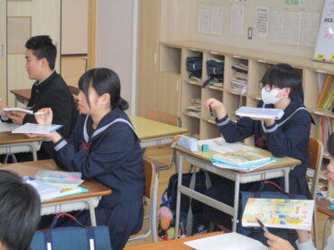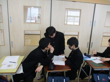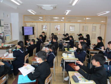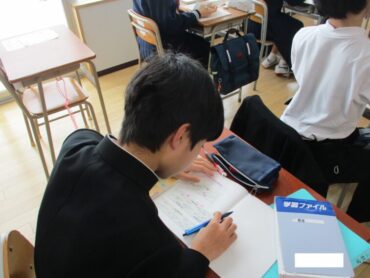 1年生は数学の時間に平面と直線の位置関係について学習していました。同じ平面上に表すことができない関係の「ねじれの位置」について、教科書とペンを使って関係性を確認していました。