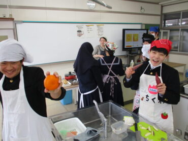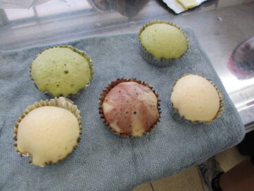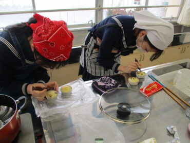 3年生は、家庭科の時間に調理実習で幼児が喜ぶ「おやつ作り(蒸しパン)」を行いました。栄養的な工夫や味、幼児が喜ぶ見た目等、各班が工夫を凝らし心を込めて作りました。チョコレートで幼児が喜ぶキャラクター等を描く班もあり、とても楽しそうでした。最後に自分たちで試食して感想を述べ合いました。いい思い出になりましたね!