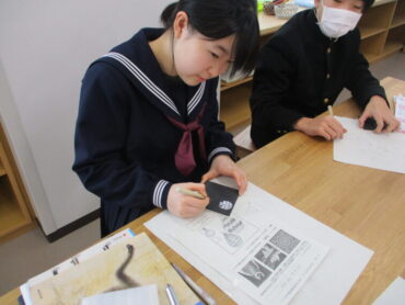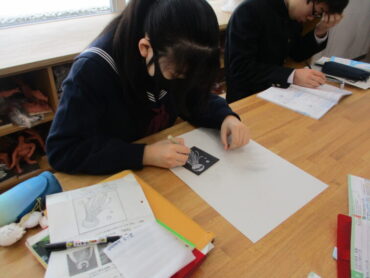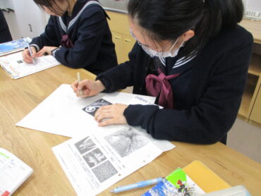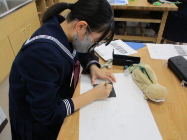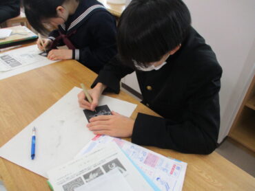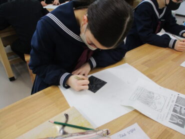 2年生は、美術の時間にスクラッチアートを行っています。スクラッチアートとは、アメリカをはじめとする海外で大ブームの新しいお絵描きで、黒いスクラッチ面をニードル等で削ると、下のタイル面の色が出てきます。幼いころにクレヨンで画用紙に色を塗り、その上から黒のクレヨンで塗つぶし、黒い面をけずると下のきれいな色が出てくる遊びを楽しんだことを思い出しました。生徒は一人ひとり自分の世界観を表現しようと、集中して取り組んでいました。