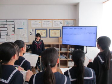 3年生は、社会の時間に持続可能な開発目標(SDGs)について個人が考えた課題をクラスの生徒の前で発表しています。今日の発表者は、戦争で家や学校を失い、逃げざるを得なくなった人たちが世界に大勢いることを伝えていました。発表者は自分事と考えて、平和の大切さを切に訴えていました。