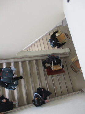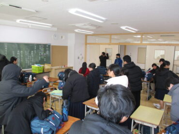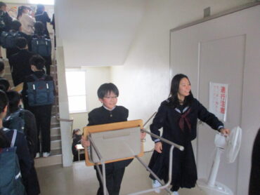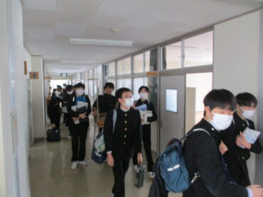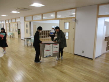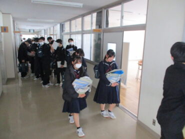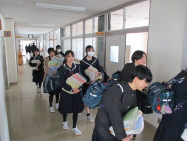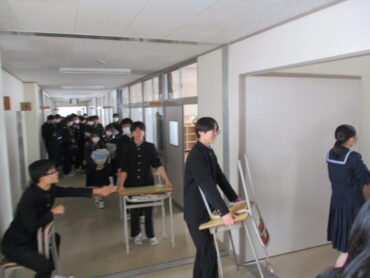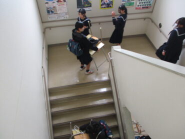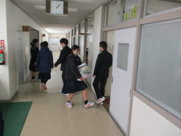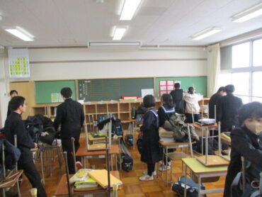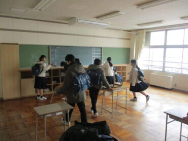 午後から全校生徒で旧校舎への引っ越しを行いました。約半年間お世話になった小学校の校舎を離れ、懐かしい中学校の旧校舎に戻ってきました。教室の配置も新しくなり、2・3年生は4階へ、1年生は3階へそれぞれ移動しました。